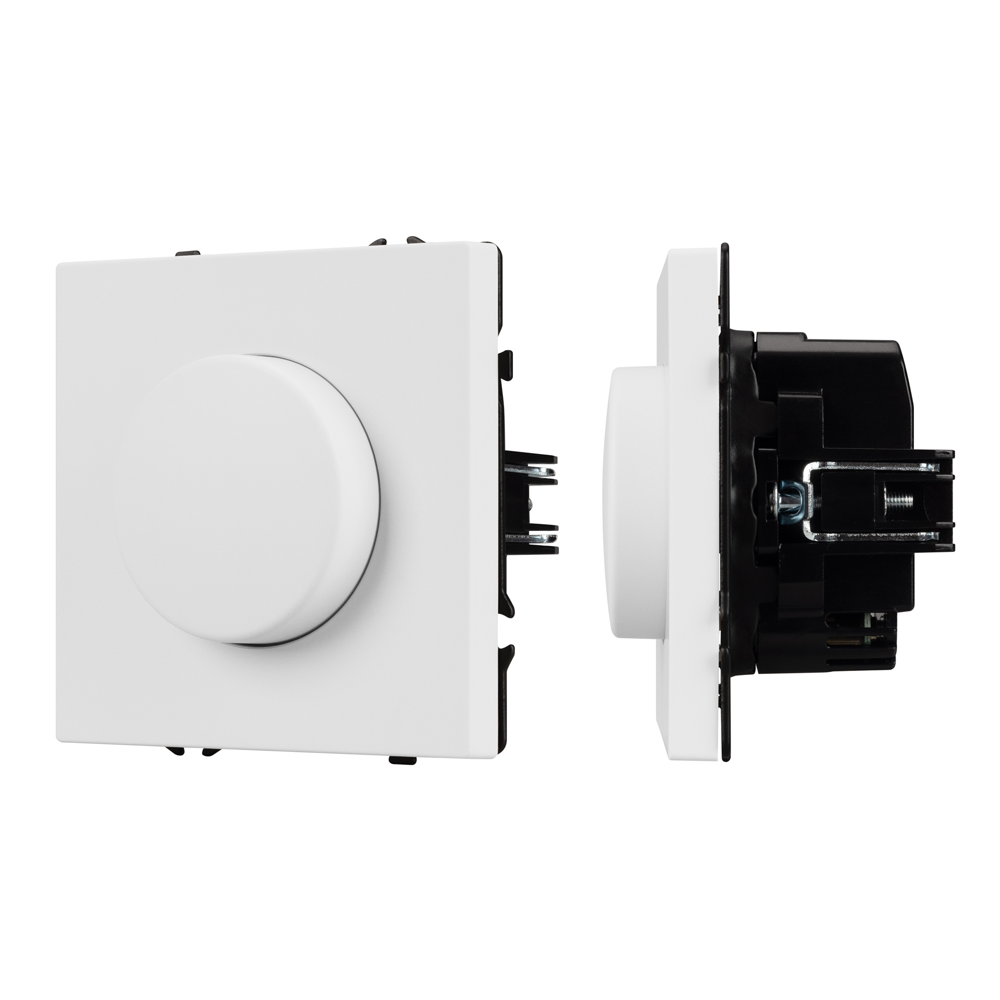 Строгие геометрические линии гармонично сочетаются с функциональностью продуманных механизмов, создавая идеальное решение для дизайн-проектов, где важны эстетика и практичность. Светорегулятор совместим с рамками серии NOBE, создавая утонченный минималистичный вид. Скрытый тип монтажа позволяет гармонично встроить в интерьер любого современного дизайн-проекта. Видимая часть механизма выполнена из высококачественного пластика цвета белый кварц и имеет Soft-Touch покрытие, что придает изделию приятные тактильные ощущения и стильный внешний вид. Настройка интенсивности освещения осуществляется за счет поворотной ручки (ротора). Она позволяет включать, выключать и регулировать свет и его яркость. Светорегулятор предназначен для управления светодиодными (до 150Вт) или другими источниками света (до 300Вт) с напряжением питания 230В. Суппорт окрашен в черный матовый цвет под основу механизма и выполнен из металла толщиной 1,5мм, что обеспечивает безопасность и уверенность в установке. На каждой стороне суппорта размещены фиксирующие элементы, позволяющие комбинировать механизмы в системы до 5шт как горизонтально, так и вертикально.