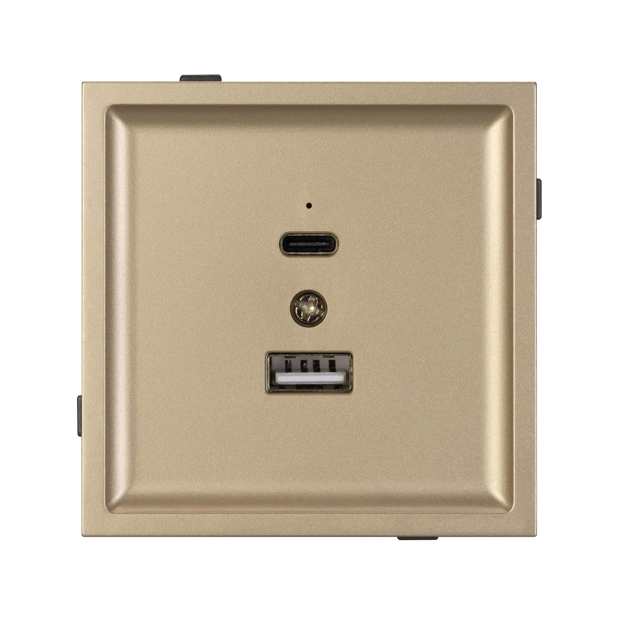 Механизм USB розетки на 2 порта Type A + Type C. Цвет - золотой, с Soft-Touch покрытием. Без фронтальной рамки. Выходная мощность для USB Type C порта не превышает 20W. Уровень пылевлагозащиты IP20. Устанавливается в стандартный подрозетник круглого сечения диаметром 60мм. Габаритные размеры: длина 71 мм, ширина 71 мм, высота 42 мм. Гарантийный срок 10 лет.