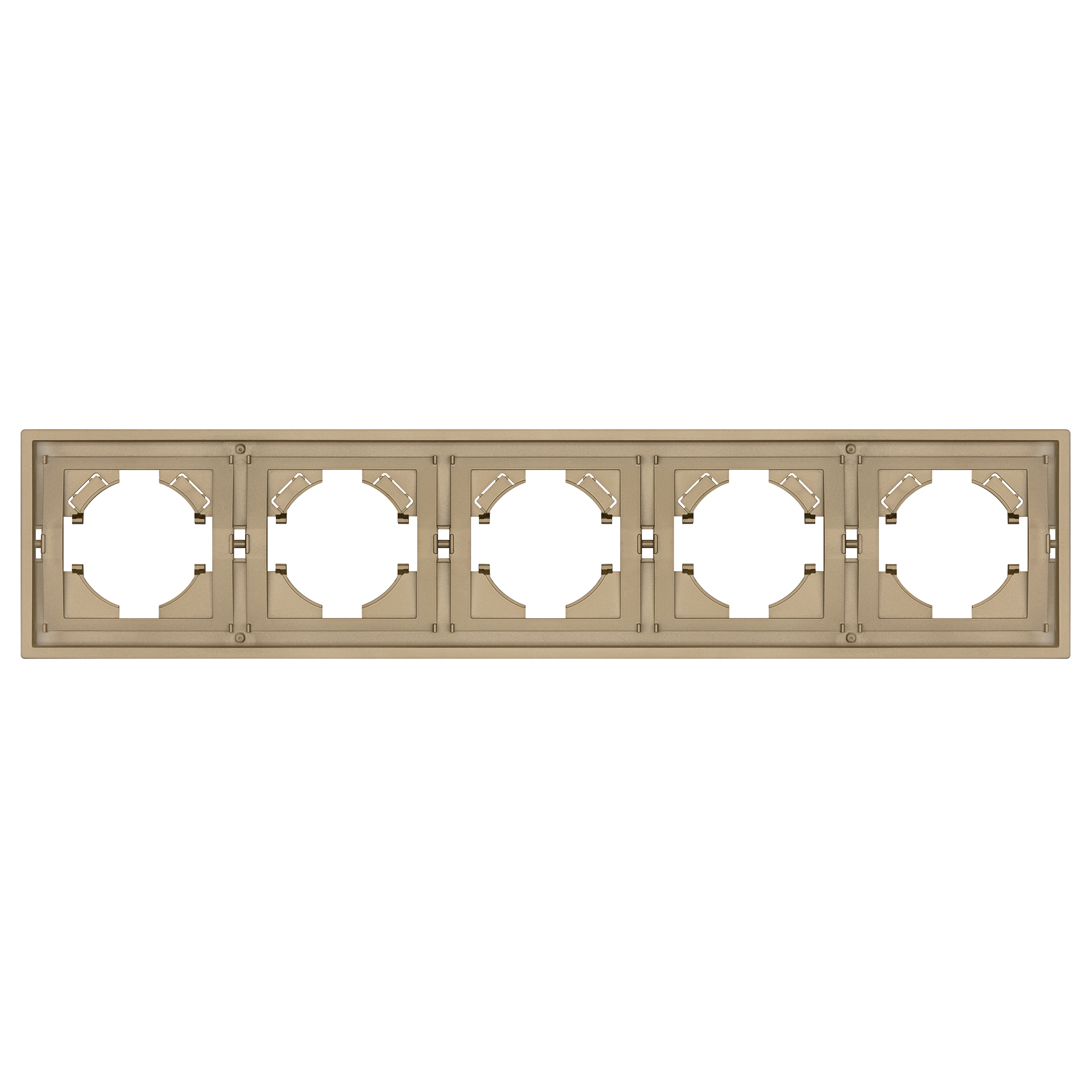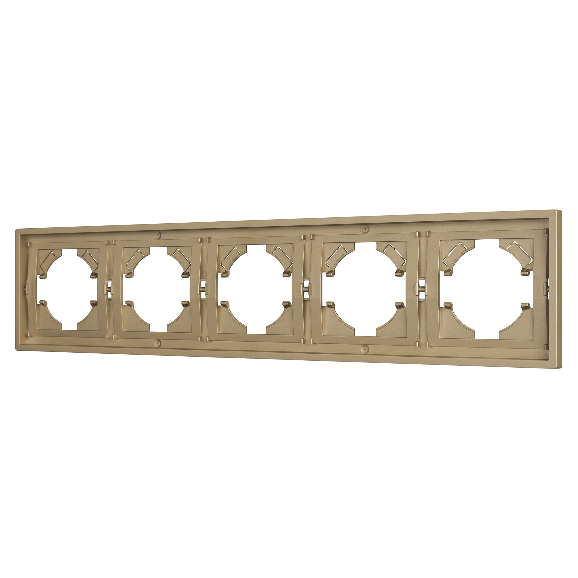 Рамка пластиковая на 5 постов, под встраиваемый механизм. Цвет - золотой, с Soft-Touch покрытием. Среднего уровня герметичности IP20. Ориентация монтажа горизонтальная. Габаритные размеры: длина 364 мм, ширина 80 мм, высота 9 мм. Гарантийный срок 12 мес.