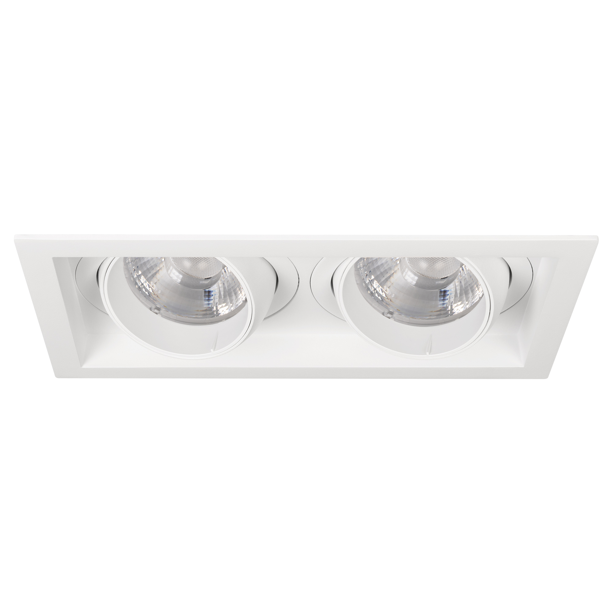 Встраиваемый карданный светильник. Мощность 2х30 Вт, св. поток 6520 лм, 109 лм/Вт, дневной 3000 K, CRI>92, угол 30°, напряжение питания 230 В. Белый корпус из алюминия, степень защиты IP20. Размер: длина 250 мм, ширина 140 мм, высота 125 мм. Монтаж встраиваемый, установочное отверстие: длина 230 мм, ширина 120 мм. Драйвер 24-42 В, 750 мА, пульсация <2%.