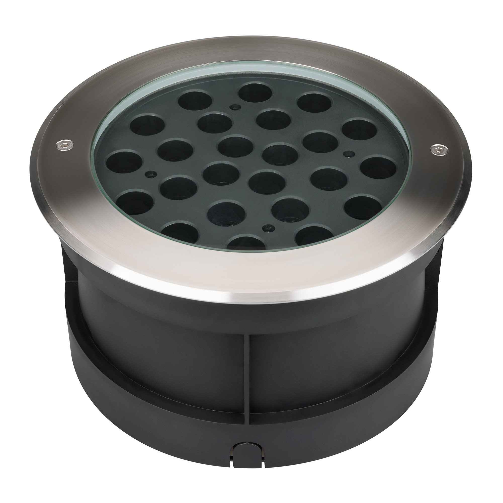 Встраиваемый светодиодный светильник для грунта и пола. Мощность 48Вт, световой поток 3250 лм, цвет дневной 4000К. CRI(Ra)>80, угол 45°. Круглый влагозащищенный корпус IP67, нержавеющая сталь. Экран закалённое стекло. Питание 230В, 48Вт. Размер DxH Ø260x150мм. Установка в отверстие DxH Ø239x144мм.