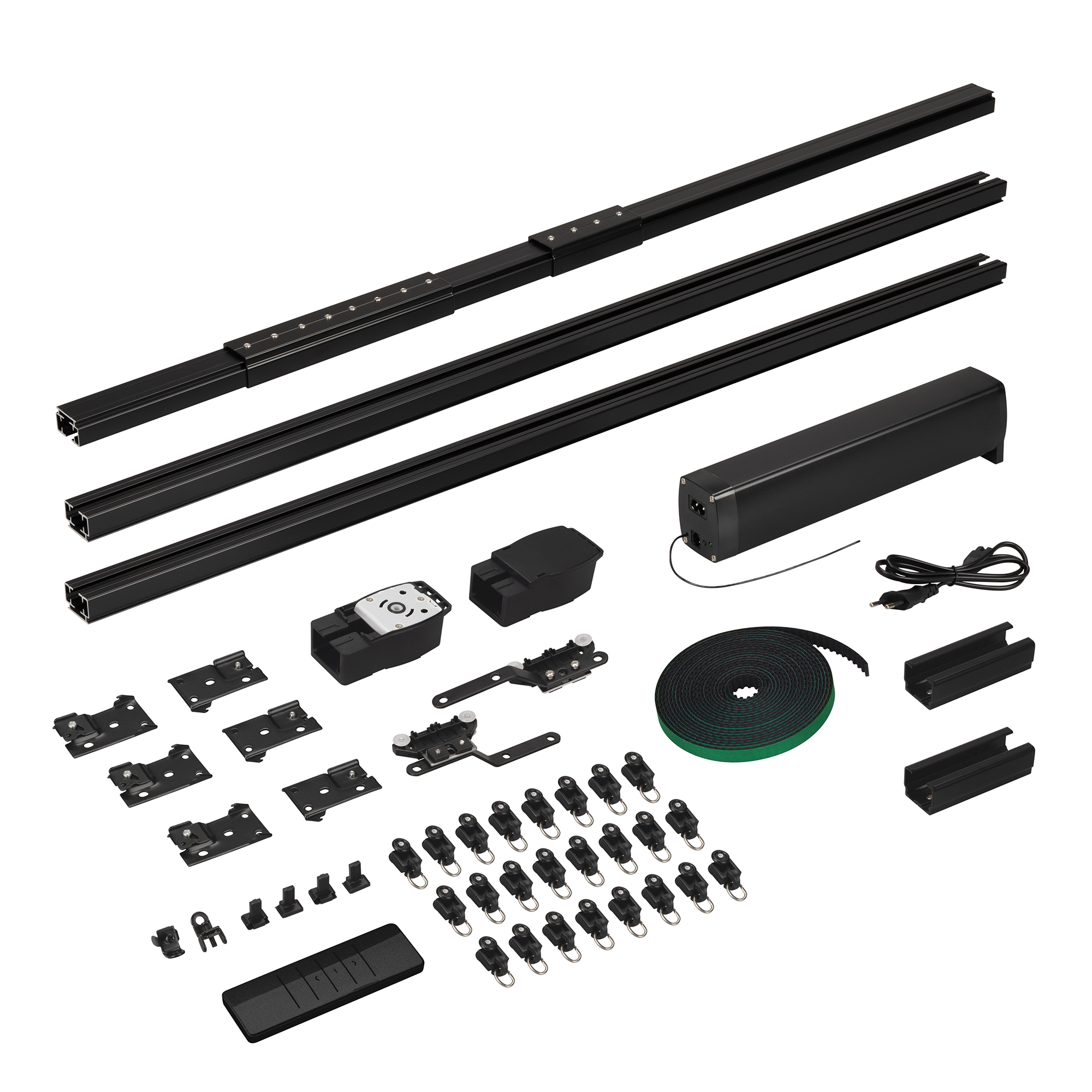 Комплект электрокарниза в черном цвете длиной до 3м (регулируется наборными частями) для раздвижных штор, состоящий из мотора, наборного алюминиевого трека, пульта и комплектующих. Электропривод с питанием 100-240В, мощность 45Вт, момент 1.2Нм, вес штор до 40кг. Управление с помощью пульта из комплекта, по WI-FI, 2.4ГГц, Bluetooth, "сухими" контактами на входе RJ45. Совместим с платформой TUYA, АЛИСА от ЯНДЕКС. Управление со смартфона через приложение SmartLife, с помощью пульта в комплекте. Ремень из комплекта находится на дне коробки. 1 мотор, 1 пульт дистанционного управления, алюминиевый профиль 1,6 мм (1м - 2шт, 0.5м - 1шт, 0.2м - 2шт., 0.1м - 1 шт.), 2 соединителя 10 см, 1 соединитель 20 см, 1 переходник 5 см, 2 шкива, 2 пряжки ремня, 2 направляющих бегунка, ремень 6,4 м, 24 бегунка, 2 фиксатора, 6 кронштейнов, 1 зажим на ремень