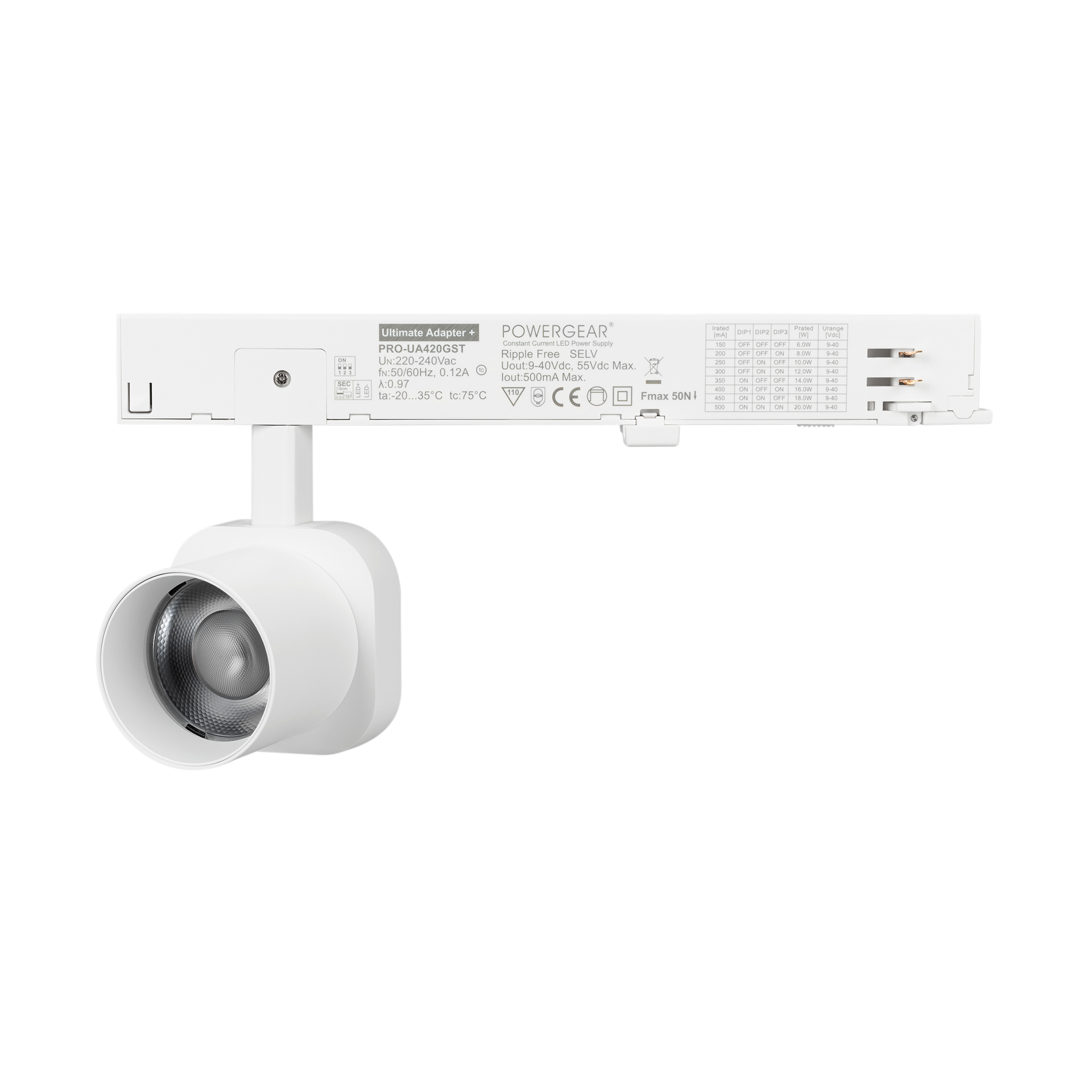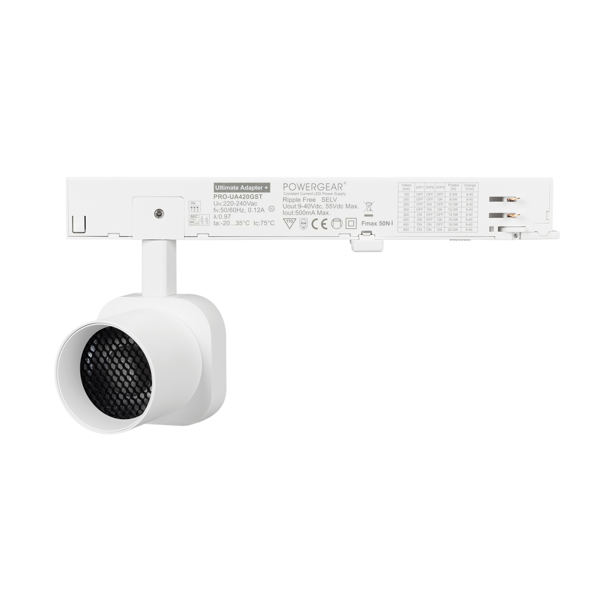Светильник для треков/шин 4 провода. Мощность 10 Вт, св. поток 800 лм, 80 лм/Вт, теплый 2700 K, CRI>95, угол 38°, напряжение питания 230 В. Решетка HONEYCOMB в комплекте. Белый квадратный корпус из алюминия, материал линзы PC поликарбонат, степень защиты IP20. Размер световой части 60х60х62 мм. Монтаж на трек 3-фазный. Драйвер встроенный 9-40 В, 250мА., пульсация <1%