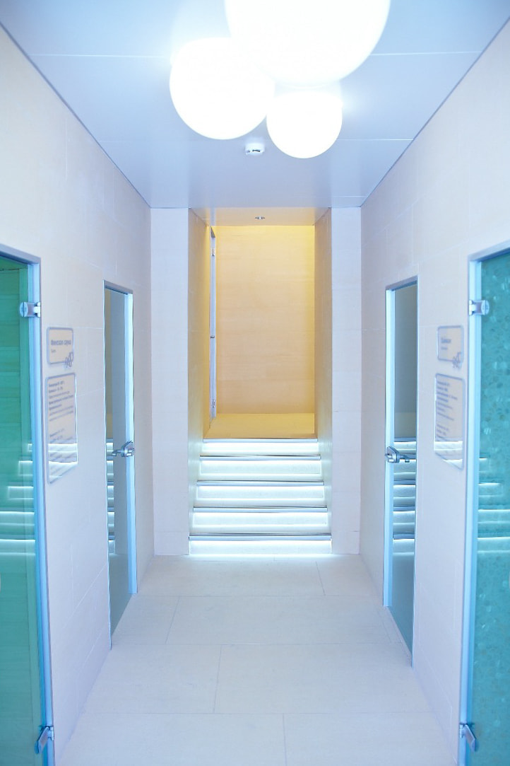 Атмосфера умиротворенности чувствуется в каждом помещении SPA-центра. Настроение передается с помощью света и цвета. Стены и ступени, обрамленные светодиодной лентой, выглядят словно парящими в воздухе. Качественная декоративная подсветка преображает интерьер, позитивно влияет на самочувствие и настраивает гостей на спокойный отдых.
