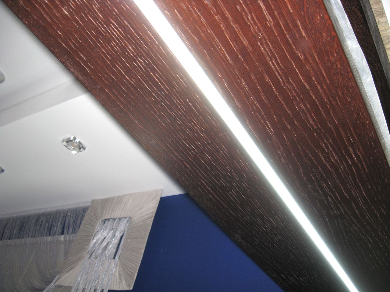 Светодиодная подсветка барной стойки с фальшкамином, подсветка потолочных ниш, а также стеклянных перегородок.